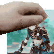 An animated sticker featuring a hand holding a picture of Gorou from Genshin Impact, depicted in armor.