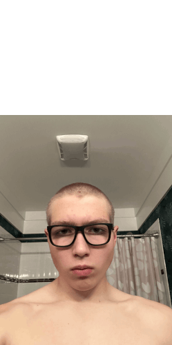 Gerald, a young man with glasses and a shaved head, subtly bounces in a bathroom setting, creating a dynamic sticker.