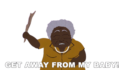Nellie McElroy, an elderly woman from South Park, angrily waves a stick and shouts "Get away from my baby!"