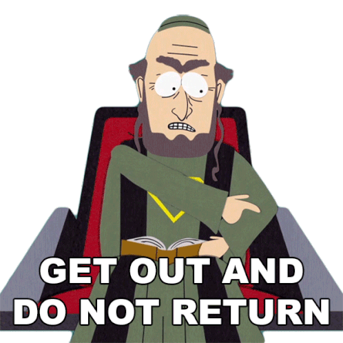 Chief Elder from South Park sternly commands, 'Get Out And Do Not Return,' with an angry expression and crossed arms.