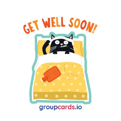An adorable animated cat sticker showing a feline resting in bed with a hot water bottle and thermometer, wishing 'Get Well Soon'.
