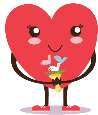A cute red heart character with a cheerful smile holds a bouquet of flowers, including smaller hearts and a butterfly, wishing 'Get Well Soon'.