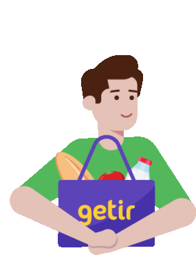 A happy Getir delivery man holds a bag of groceries, surrounded by floating yellow hearts, symbolizing satisfaction.