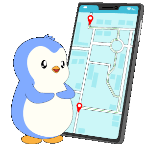A cute blue penguin stands beside a smartphone displaying a map, seemingly lost or navigating a journey.
