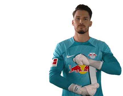 a soccer player wearing a blue jersey with a red bull on it