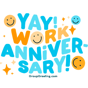 Animated sticker celebrating a work anniversary with a cheerful 'Yay!' message, perfect for digital greetings.
