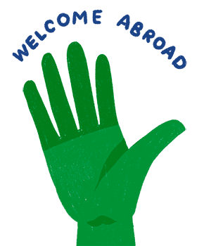 A vibrant green hand is shown with the welcoming phrase 'WELCOME ABROAD' arched above it.