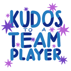 Animated text sticker celebrating teamwork, featuring 'KUDOS TO A TEAM PLAYER' with sparkling purple stars.
