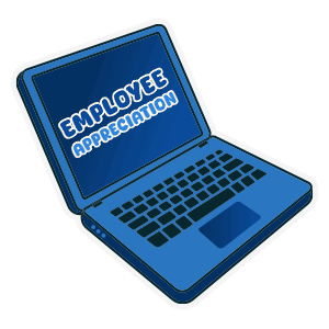 Animated sticker of a blue laptop displaying 'Employee Appreciation' on its screen, related to Pitney Bowes and GroupGreeting.