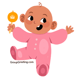 A cheerful baby girl in a pink romper happily holds and shakes a yellow rattle with a crown.