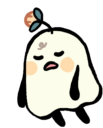A cute, round ghost character with a flower on its head looks confused or annoyed, expressing 'Say What'.