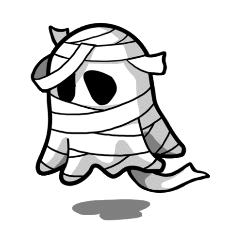A cute, cartoonish ghost or mummy figure, wrapped in bandages, floats with a shadow.