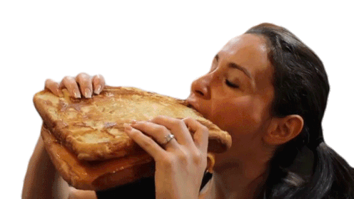 A woman takes a massive bite out of a giant grilled cheese sandwich, looking surprised and hungry.