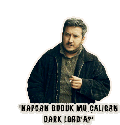 Yılmaz from Gibi, holding a cigarette, with the iconic Turkish quote 'Are you going to play the flute for the Dark Lord?'