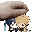 Scaramouche and Aether, two anime characters, are sitting together under a table, possibly in a playful or meme-like moment.