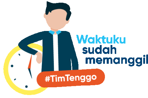 An animated sticker of a person next to a clock, indicating it's time to go home or finish work, with the text 'My time has called' and '#TenggoTeam'.