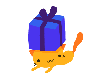 a cat carrying a blue gift box on its head