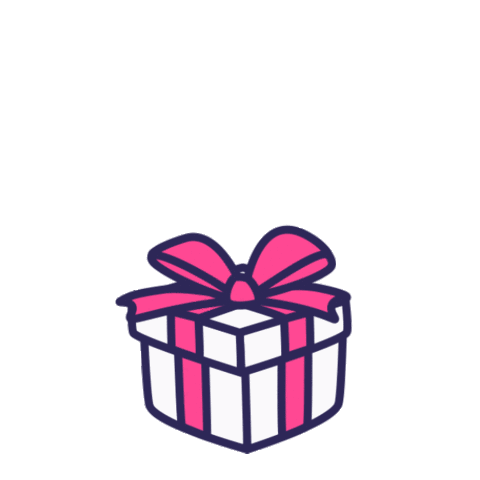 A cheerful purple character with three eyes pops out of a striped gift box, surrounded by colorful confetti, celebrating a special occasion.