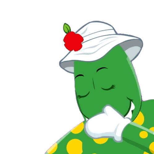 Dorothy the Dinosaur from The Wiggles giggles shyly, covering her mouth with a gloved hand, wearing her signature hat.