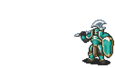 Gilliam, a pixel art knight in teal armor, performs a powerful axe attack animation.