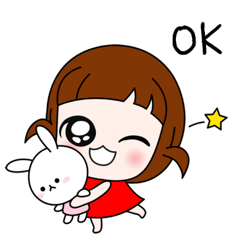 Adorable cartoon girl in a red dress holding a white bunny, with 'OK' and a star appearing above her.