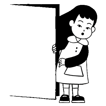 A cartoon girl with long black hair peeks from behind a white wall, looking curious, shy, or perhaps playing hide-and-seek.