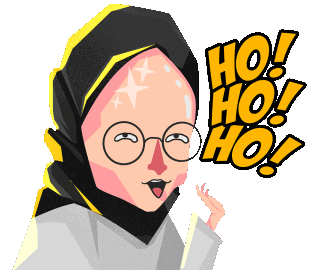 Aisya, a cheerful girl in a hijab and glasses, laughs heartily with 'HO! HO! HO!' speech bubbles, expressing joy and humor.