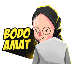 Aisya Laweh, a cartoon character in a hijab and glasses, playfully sticks out her tongue with the Indonesian phrase 'Bodo Amat' (I don't care).