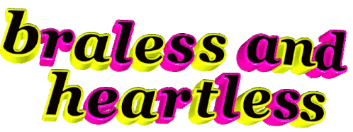 Animated text sticker displaying 'braless and heartless' in vibrant pink and yellow 3D letters, conveying a bold and funny message.