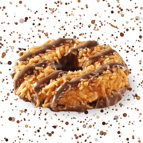 A delicious Girl Scout Samoa cookie, featuring a ring of toasted coconut and caramel, drizzled with rich chocolate.
