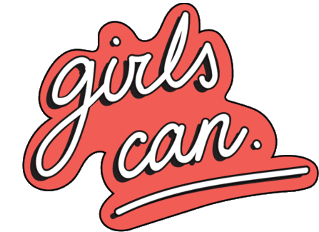 An empowering sticker featuring the phrase 'girls can' in a stylish white font on a vibrant red background, symbolizing female strength and potential.