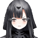 a close up of a girl 's face with long black hair and a triangle on her head .
