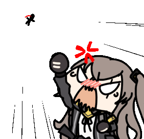 Girls Frontline's UMP45 angrily swats at a tiny bug, showing her frustration with a blush and angry symbol.