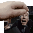 a hand is reaching out towards a man in a suit and tie in a blurry photo .