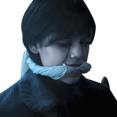 Wednesday Addams, gagged with a cloth, gives a fierce glare and side-eye expression.