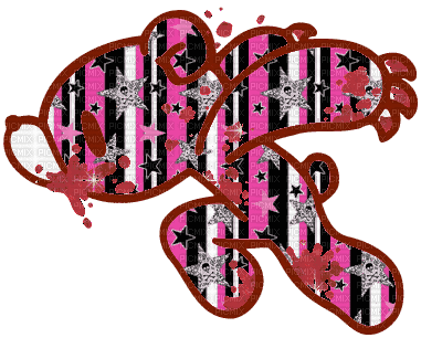 Gloomy Bear style abstract sticker featuring pink and black stripes, glittery stars, and blue paint splatters.