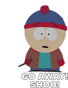 Stan Marsh from South Park, holding a stick, tells someone to "GO AWAY! SHOO!" with a slightly annoyed expression.