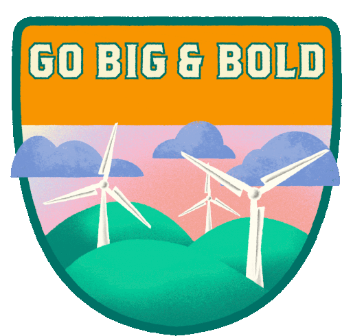 Animated sticker featuring the text 'Go Big & Bold For Real Recovery' above a landscape with wind turbines.