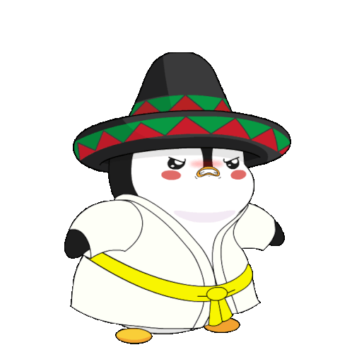 An excited cartoon penguin in a sombrero and gi celebrates with a 'woohoo' expression, perfect for team spirit.