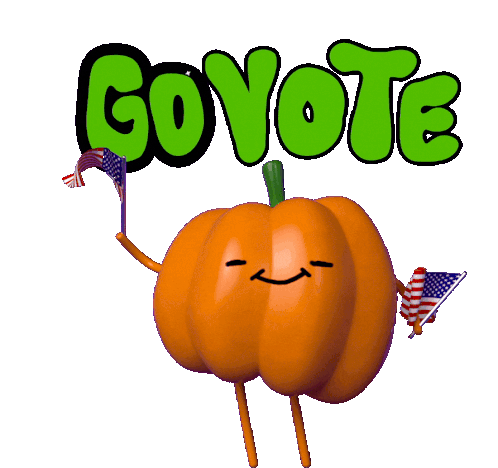 A cheerful dancing pumpkin holds American flags, encouraging viewers to 'Go Vote' in a vibrant, animated sticker.