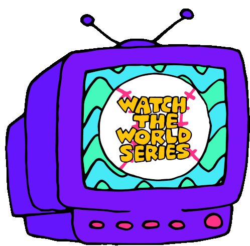 A retro TV displays a baseball graphic with messages to 'Watch the World Series' and 'Make a Plan to Go Vote'.