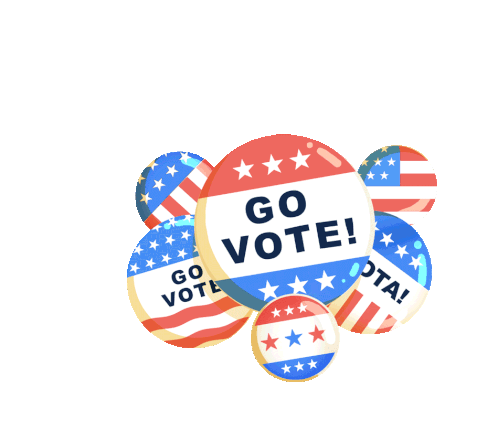 Animated patriotic buttons urging people to 'GO VOTE!' and '¡VOTA!', featuring stars and stripes.