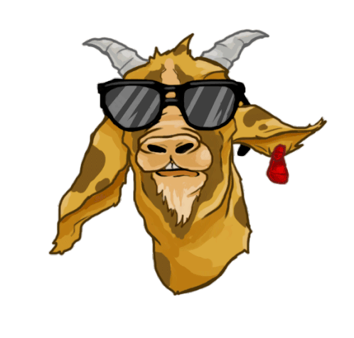 An animated cool goat wearing sunglasses, with an open mouth and a red ear tag, saying 'BÉE'.