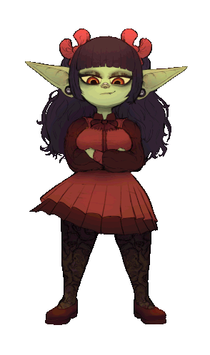 Animated sticker of Phoebe Bane's Goblin Ankha character, a cute green-skinned girl with red dress and bows.