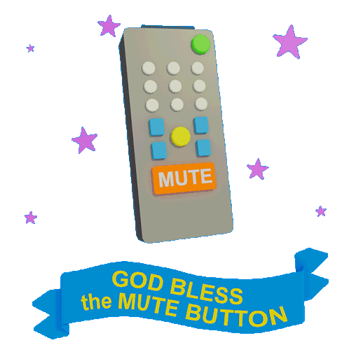 An animated remote control with a prominent 'MUTE' button, surrounded by stars, with the caption 'GOD BLESS the MUTE BUTTON'.