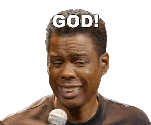 Chris Rock exclaims "God!" with an emotional expression, captured from a performance, holding a microphone.