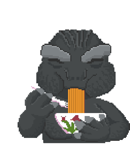 A pixel art Godzilla, also known as Gojira, enjoys a bowl of noodles, possibly Indomie or Mie Ayam.
