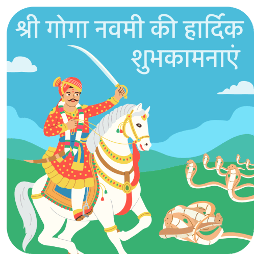 Vibrant sticker for Goga Navami, featuring a warrior on horseback with a sword and snakes, conveying festive wishes.