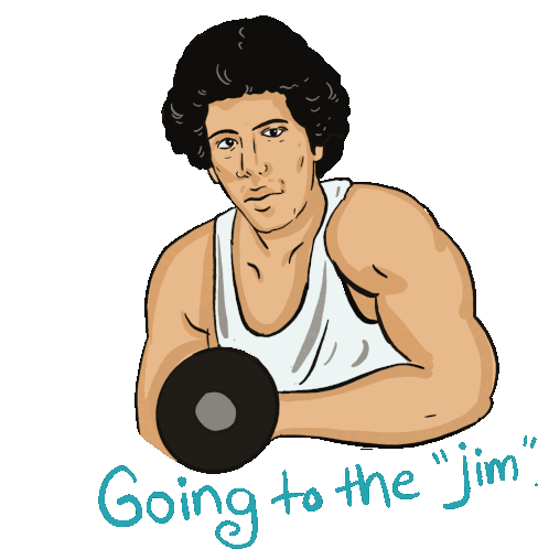 Cartoon sticker of a muscular man flexing his bicep with a dumbbell, ready for a workout. Features the text 'Going to the "jim".'