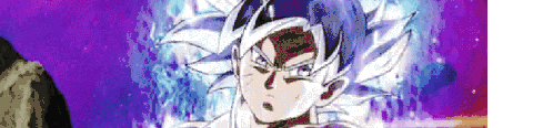 Goku Ryan Ebut W in his powerful Ultra Instinct form, surrounded by a vibrant purple and blue energy aura.